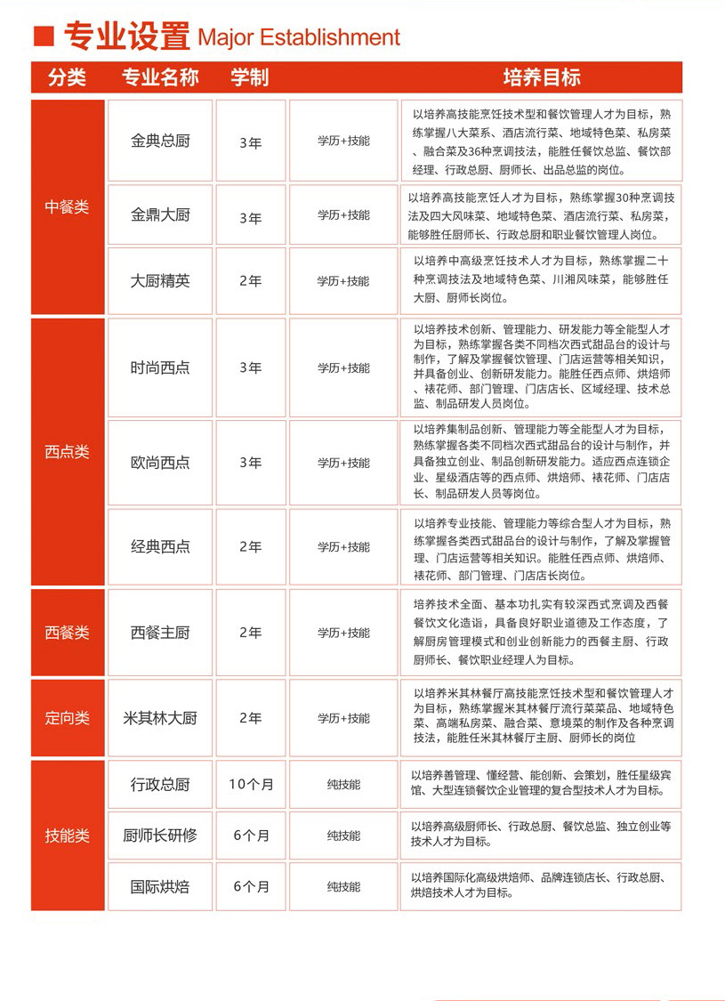 招生专业金典总厨、金鼎大厨、大厨精英、时尚西点、欧尚西点、经典西点、西餐主厨、米其林大厨、行政总厨、厨师长研修、国际烘焙等。